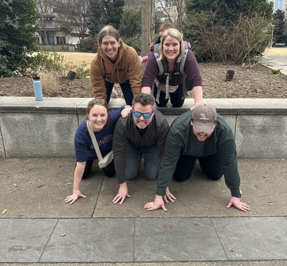 Teams ventured to the Spectrum Center, which is home to the Charlotte Hornets NBA team! This location was the perfect backdrop for a basketball-themed challenge. Teams were tasked with capturing a photo of a basketball-style ‘Jump Ball’ moment in front of the arena. Participants had to simulate the excitement of the game’s start, with two members posing as if vying for the ball.