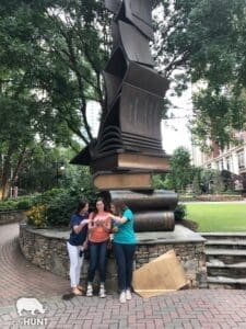 In the heart of Charlotte, The Green is a delightful park that celebrates literature and art. The park is divided into three sections, each representing a different genre of literature: history, the arts, and geography. Visitors can find sculptures, fountains, and even a walkway with quotes from famous authors embedded in the pavement. The challenge for teams was to find the iconic bronze books statue and capture a photo of their own storytime session.