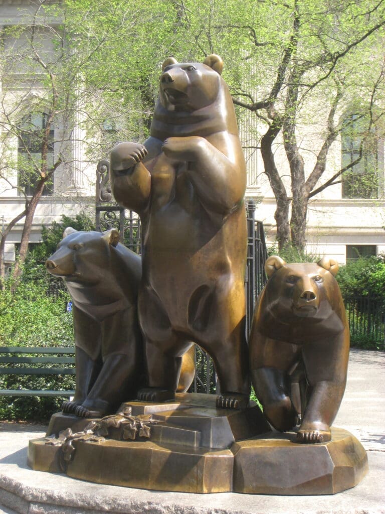 The Group of Bears statue is located at the Pat Hoffman Friedman Playground in Central Park, depicting three bears on a pedestal. The statue is about 7 feet 4 inches tall.