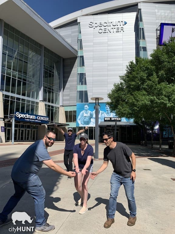 Teams ventured to the Spectrum Center, which is home to the Charlotte Hornets NBA team! This location was the perfect backdrop for a basketball-themed challenge. Teams were tasked with capturing a photo of a basketball-style ‘Jump Ball’ moment in front of the arena. Participants had to simulate the excitement of the game’s start, with two members posing as if vying for the ball.