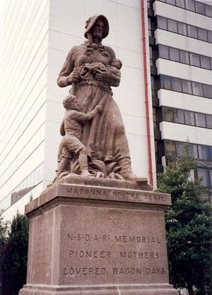 Plaque seekers will trace the National Old Trails Road, following August Leimbach’s series of work commemorating the pioneer women who journeyed West.