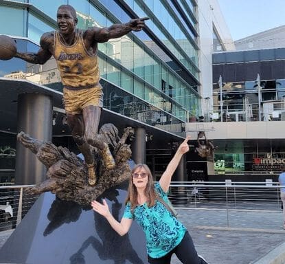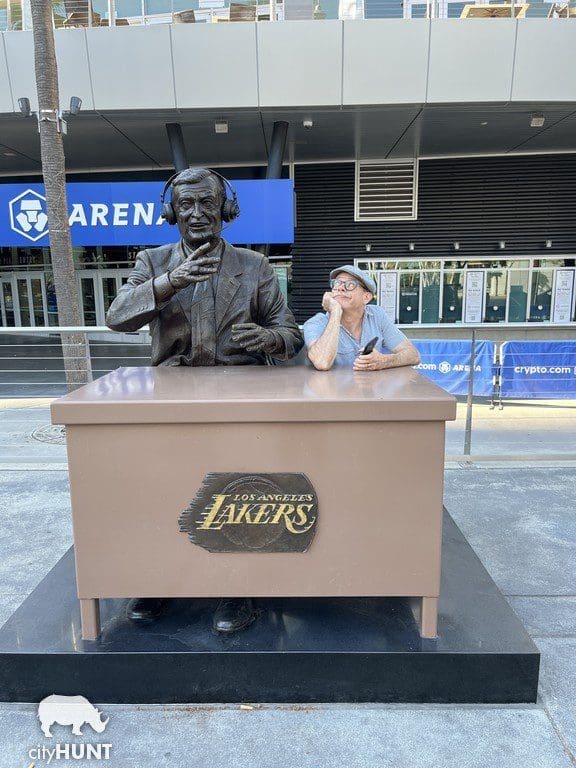 Teams ventured to the area in front of the Cryto.com Arena, where bronze statues of iconic Lakers players stand in honor of their contributions to the sport. The challenge was to take a photo of a teammate imitating the pose of one of the bronze statues of legendary Lakers players in front of the area. This team chose to pose with the legendary Magic Johnson.